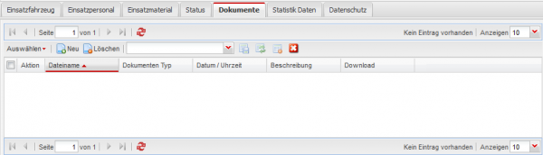 Über den Reiter Dokumente im unteren Teil der Detailansicht des Einsatzes haben Sie die Möglichkeit beliebig viele Dokumente zum Einsatz hinzuzufügen.