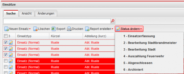 Durch einen Klick auf die jeweilige Schaltfläche wird der Status direkt auf den angezeigten Wert geändert. Im untenstehenden Beispiel ist das der Status 6 beim Erhöhen und der Status 4 beim Reduzieren. Wenn Sie auf den kleinen Pfeil auf der Schaltfläche klicken haben Sie auch die Möglichkeit den Status des Einsatzes auf einen bestimmten Status zu setzen.
