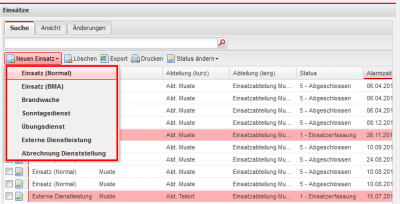 Wenn Sie hier die Schaltfläche Neuer Einsatz betätigen öffnet sich ein Menü, wo Sie auswählen können welche Art von Einsatz / Vorgang Sie erfassen wollen.