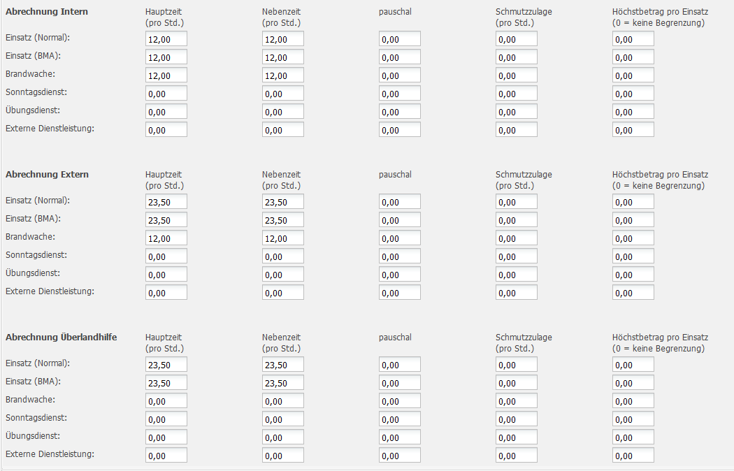 Im Folgenden finden Sie eine Liste der verschiedenen Kostensätze die definiert werden können. Die folgenden Felder sind jeweils pro Einsatztyp, für die intern- und externe Abrechnung sowie für die Abrechnung an eine andere Gemeinde (Überlandhilfe) definierbar