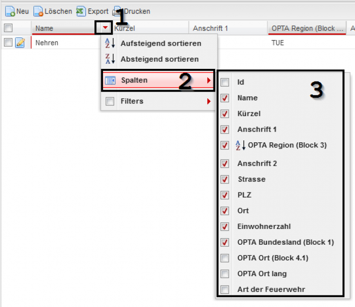 Über den roten Pfeil (1) öffnet sich das Menü für die Spalte. Über den Eintrag Spalte (2) erscheint eine Liste der Spalten. In der Spaltenliste (3) kann definiert werden, welche Spalten angezeigt werden.