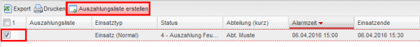 Es können allerdings nur Einsätze die sich im Status 4 befinden ausgewählt werden. Dies verhindert, dass versehentlich Einsätze mehrfach ausbezahlt werden.