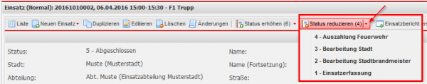 Durch einen Klick auf die jeweilige Schaltfläche wird der Status direkt auf den angezeigten Wert geändert. Im untenstehenden Beispiel ist das der Status 6 beim Erhöhen und der Status 4 beim Reduzieren. Wenn Sie auf den kleinen Pfeil auf der Schaltfläche klicken haben Sie auch die Möglichkeit den Status des Einsatzes auf einen bestimmten Status zu setzen.