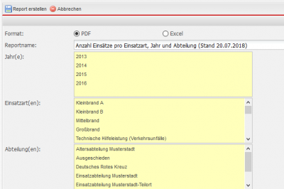 In diesem Report haben Sie die Möglichkeit sich auflisten zu lassen, welche Abteilung in welchem Jahr wie viele Einsätze einer bestimmten Einsatzart hatte.