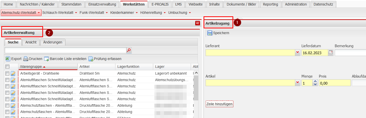 Verwaltung & Zubuchung Atemschutz relevater Artikel